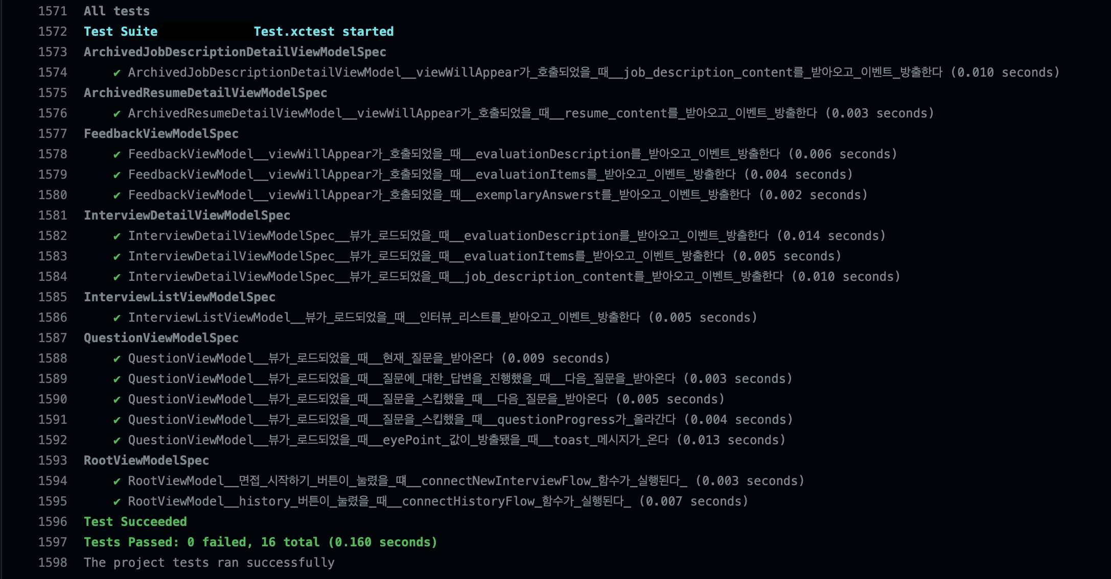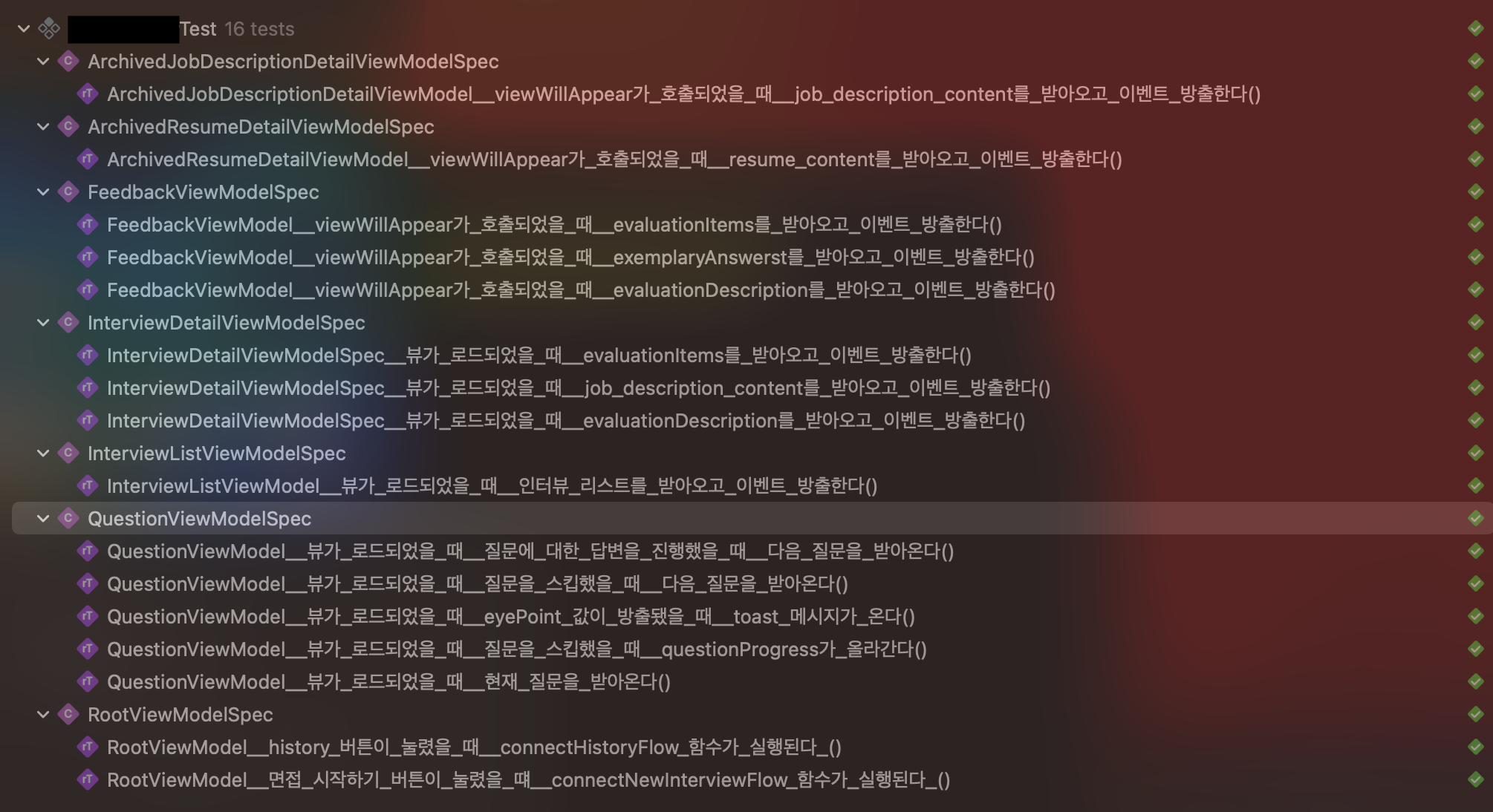 위와 같이 어떤 ViewModel에서 어떤 상황에서 어떤 결과가 정상적인지, 정상적이지 않은 지를 확실하게 확인할 수 있고, 이를 통해서 코드의 로직이 잘못되었을 때 바로바로 확인을 할 수 있었다.