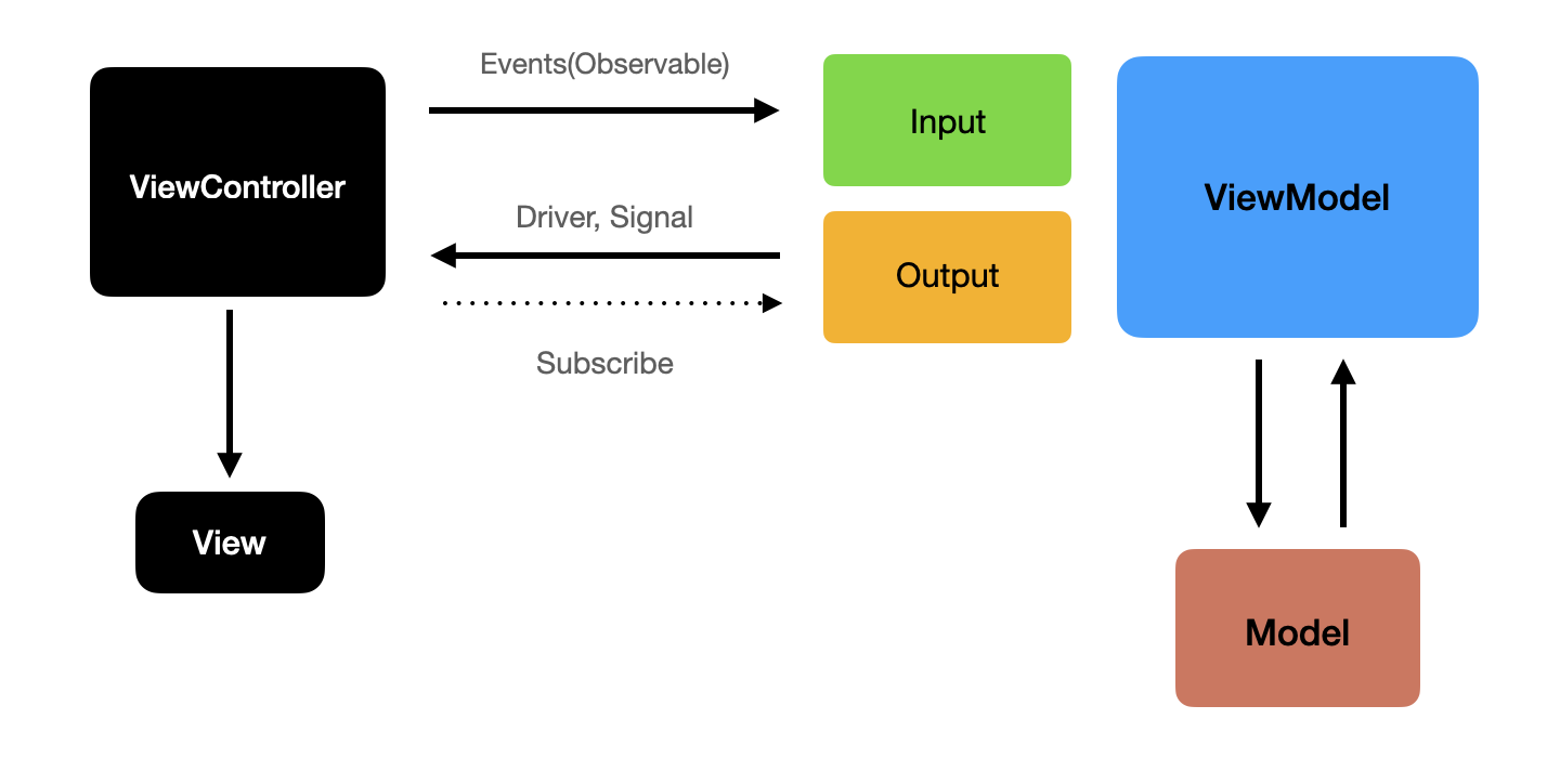 이를 통해 ViewController는 ViewModel이 어떤 일을 하는지 모르고 발생하는 이벤트들은 input에 넣어서 전달하고, 뷰에 보여줘야 하는 값들은 output으로 받아서 보여주기만 하면 되도록 할 수 있었습니다.