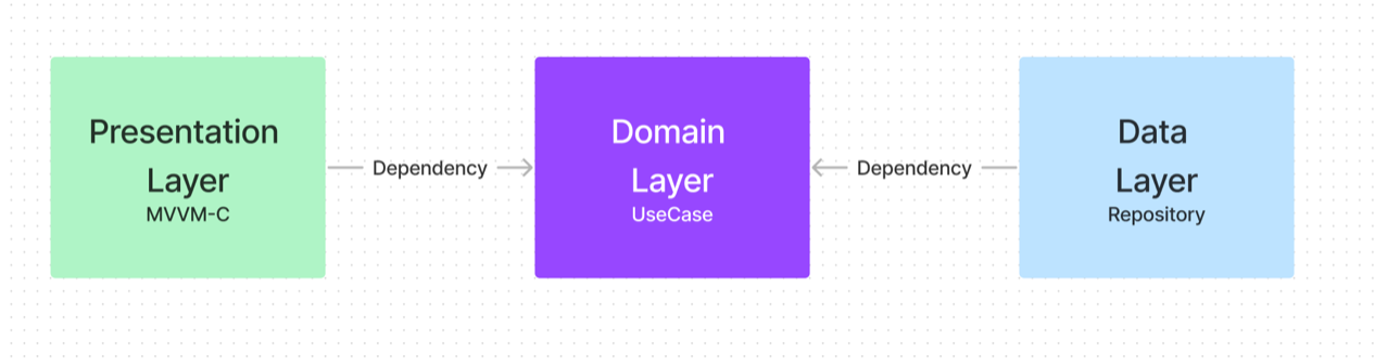 Domain Layer는 Data Layer, Presenter Layer의 정보들을 모른 채 그저 비즈니스 로직만을 담당하게 됩니다.