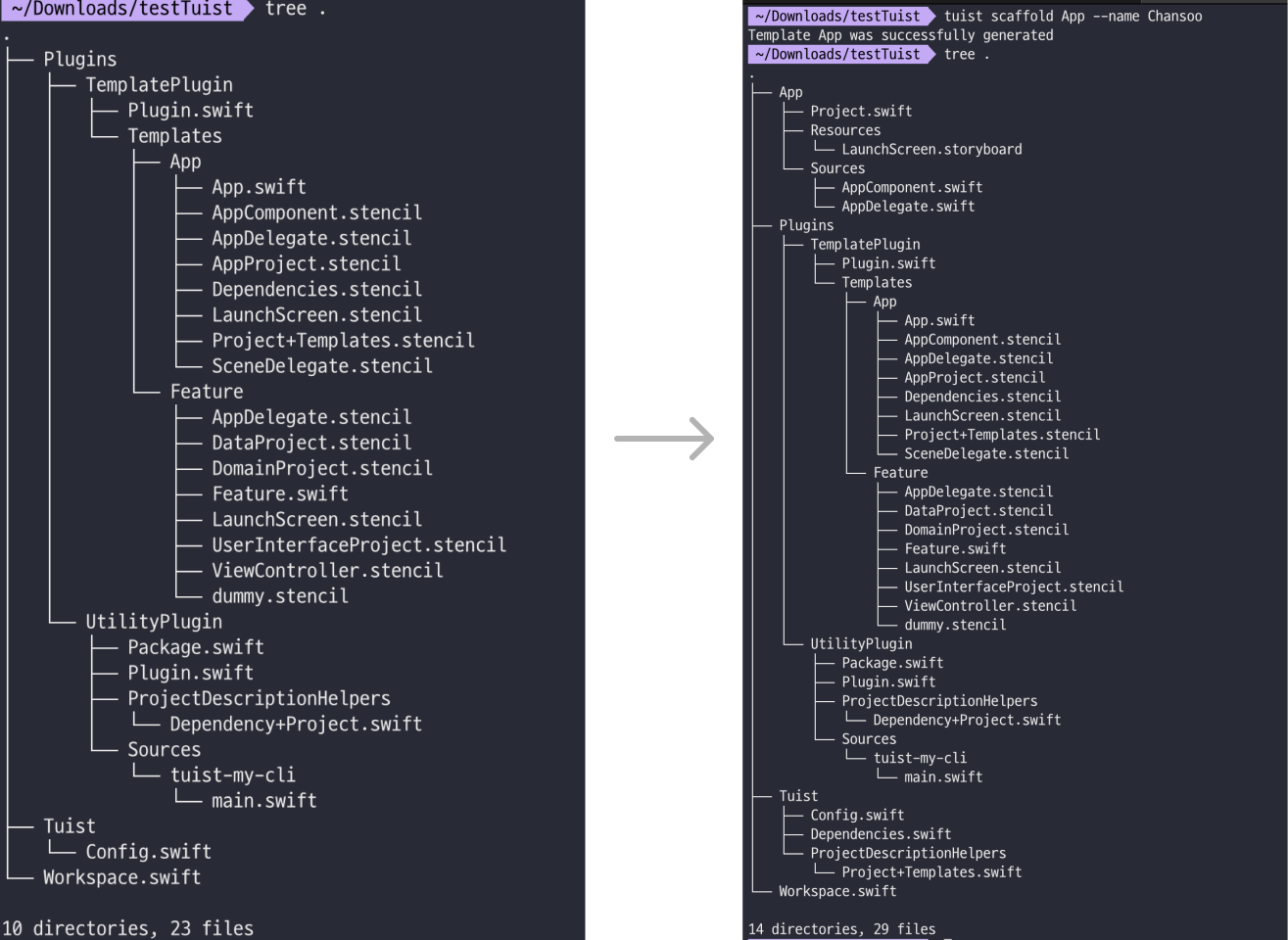 왼쪽처럼 플러그인들만 추가한 상태에서 tuist scaffold App --name Chansoo 다음과 같은 명령어를 사용하게 되면 오른쪽과 같이 App이라는 폴더 내부에 앱 최상단을 담당하는 프로젝트에 필요한 기본 요소들이 생기게 됩니다. 또한 Tuist 폴더 내부의 Dependency와 Project+Templates 파일 또한 만들어주게 됩니다.