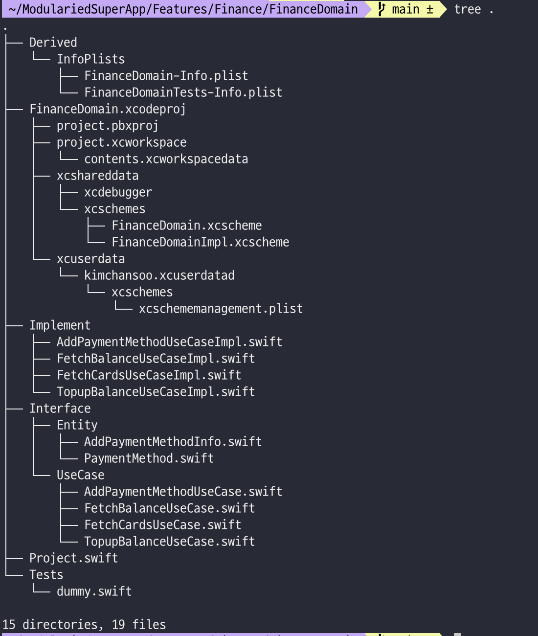 Interface는 다른 모듈에서 사용할 때 필요한 Entity와 UseCase(프로토콜)로 되어 있고, Implement는 Interface의 UseCase들의 구현부들이 위치하고 있습니다.